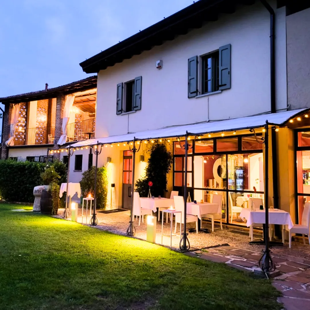 Una cascina immersa nel verde affacciata sul lago di Iseo, con sale interne accoglienti e un dehors panoramico sulle Torbiere del Sebino.